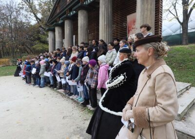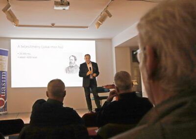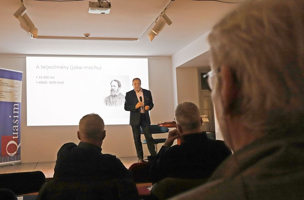 A kiserdei közös szavalás után Cserépné Urbán Ildikó a program főszervezője mondott beszédet az egykori kőszínház oszlopainál majd stílszerűen Balázs Géza nyelvész, egyetemi tanár tartott, Jókai és a magyar nyelv, címmel előadást a Szőcs Irodalmi Szalonban.
